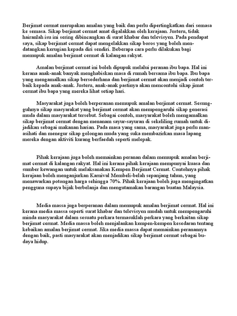 Contoh Karangan PT3 Cara-Cara Memupuk Amalan Berjimat Cermat Berjimat cermat merupakan amalan yang baik dan perlu dipertingkatkan dari semasa ke semasa. Dapat mengurangkan perbelanjaan harian membeli barangan keperluan sahaja membeli barang buatan tempatan murah. Dengan situasi ekonomi Malaysia yang tengah menjunam sekarang adalah lebih baik kita berjimat cermat daripada kerap berbelanja.